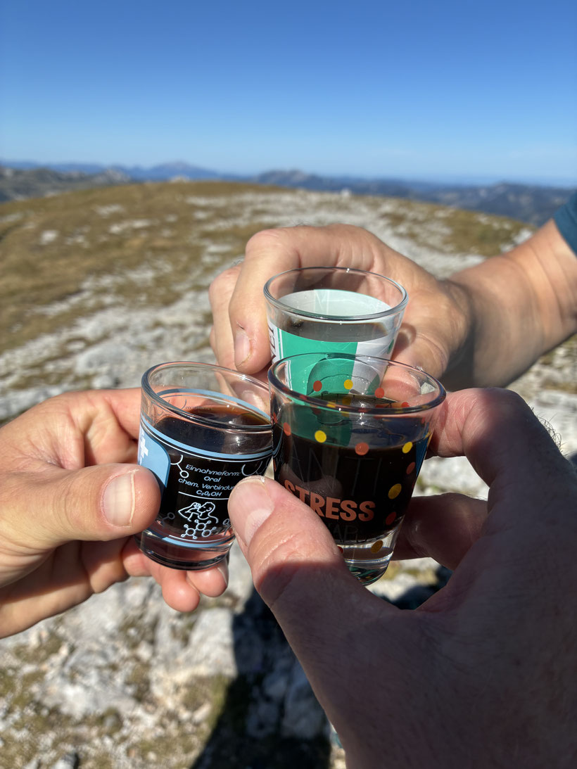Peter hat wieder seinen guten Nussschnaps und sogar echte Gläser mit