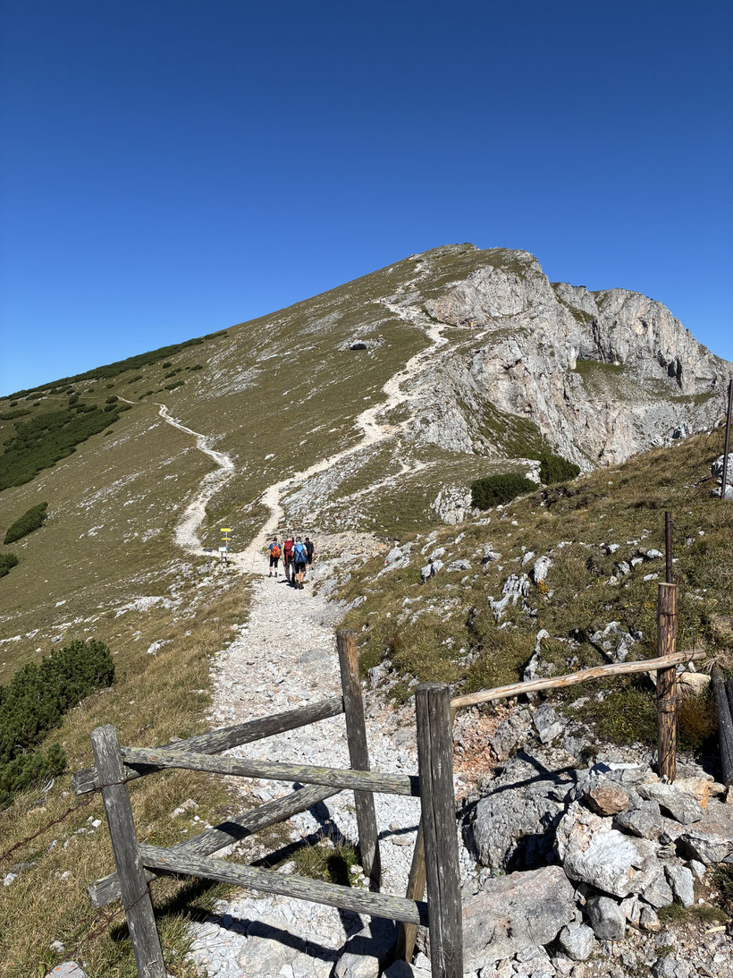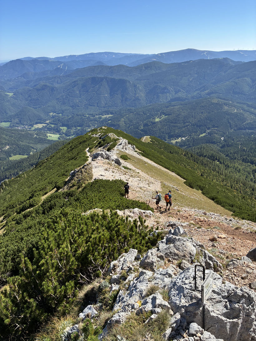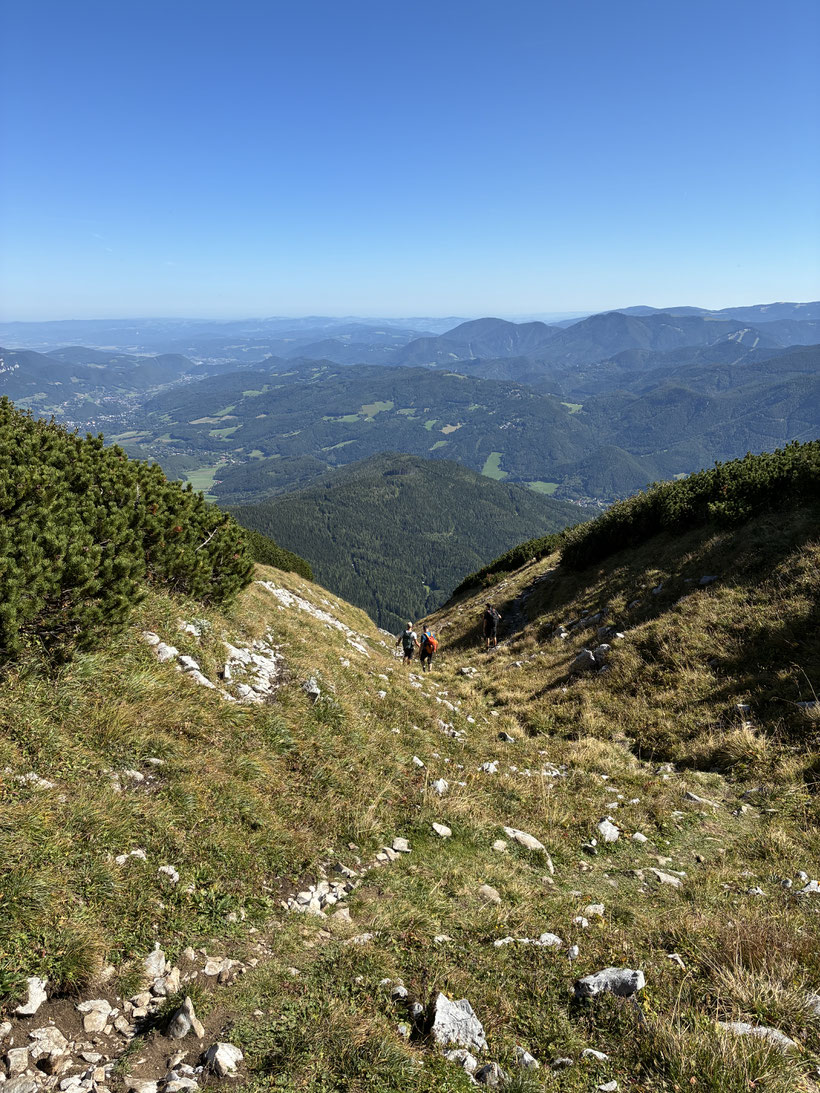 runter gehts mit Blick zum Schneeberg über den Waxriegelsteig