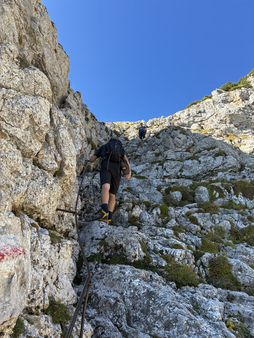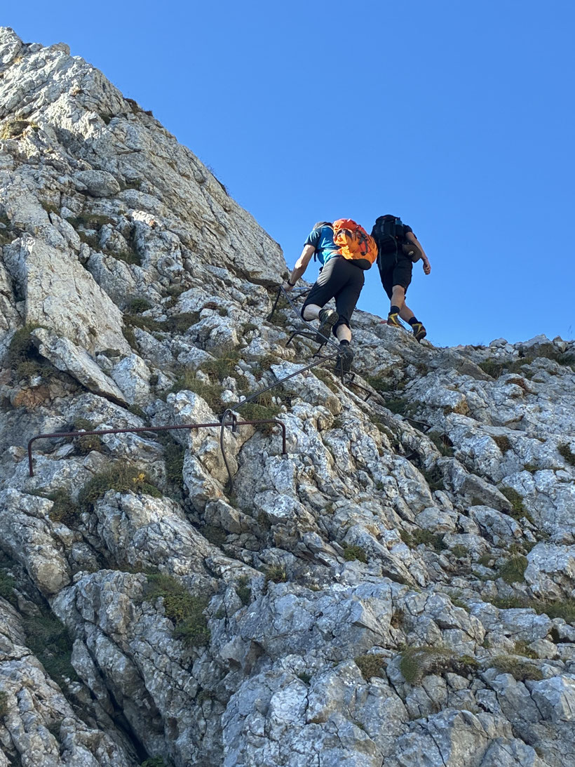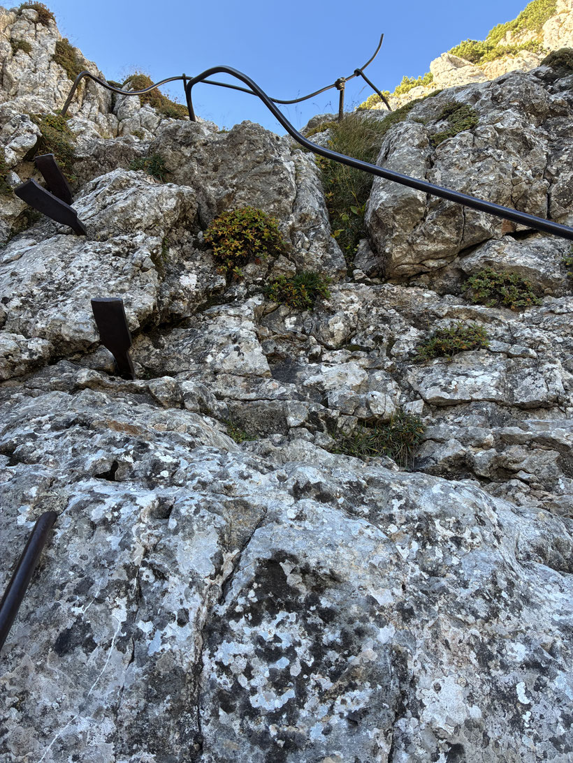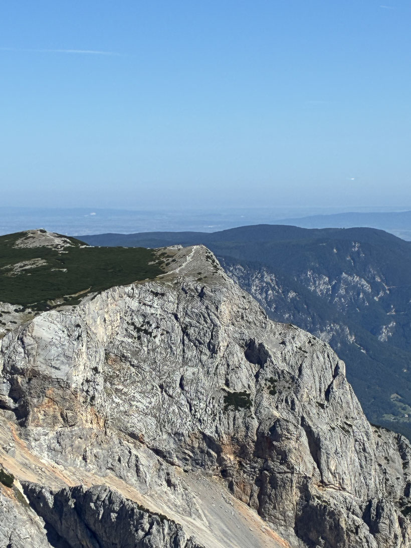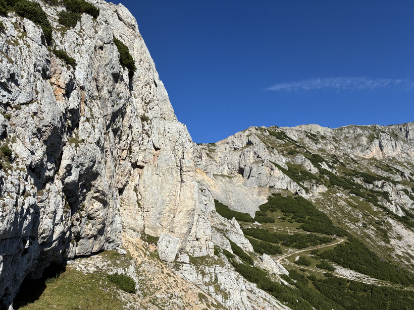schön zu sehen der Schlangenweg und links davon die Wände durch die der Karl Kantner Steig verläuft, über welchen wir aufgestiegen sind