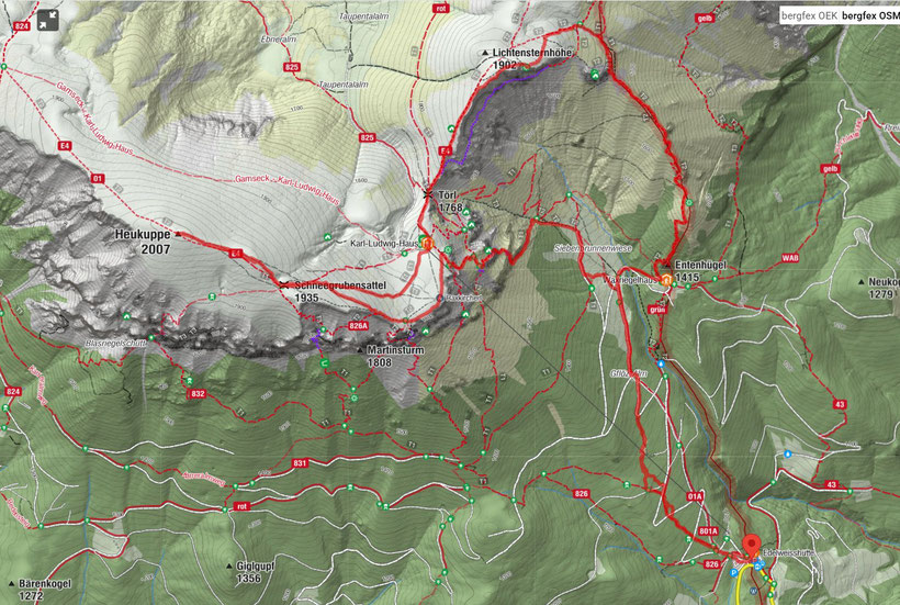 unter uns ist schon das Waxriegelhaus zu sehen, wo wir noch auf ein Bier einkehren